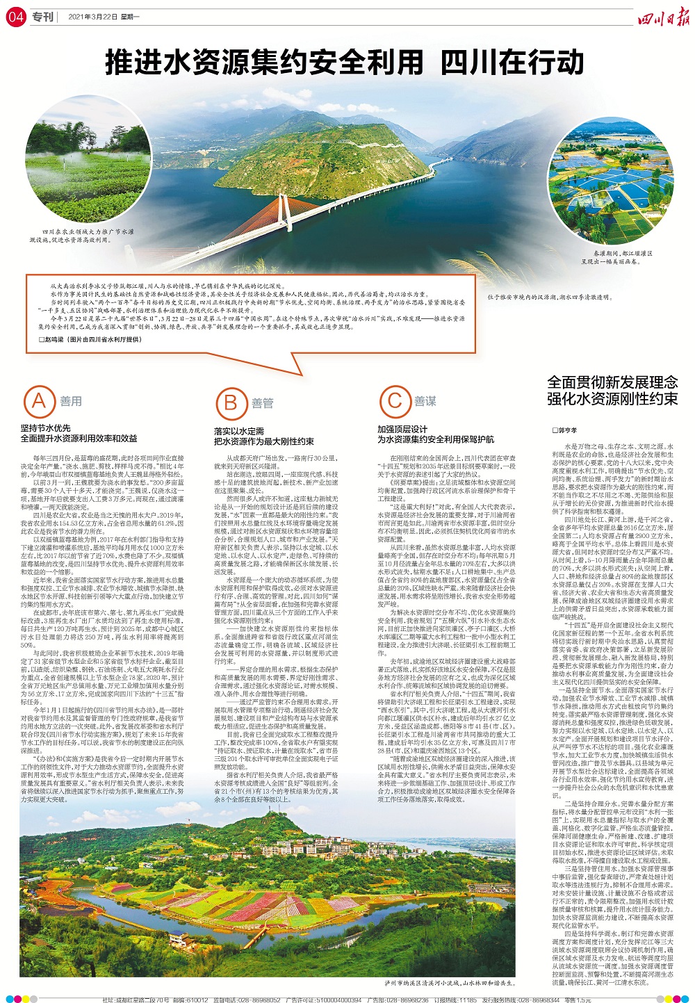 四是堅持科學調水。制訂和完善水資源調度方案和調度計劃,充分發揮沱江等三大流域水資源調度聯席會議協調機制作用,確保區域水資源及水力發電、航運等調度均服從流域水資源統一調度。加強水資源調度管控斷面監測、預警和處置,不斷提高河湖生態流量,確保長江、黃河一江東流。