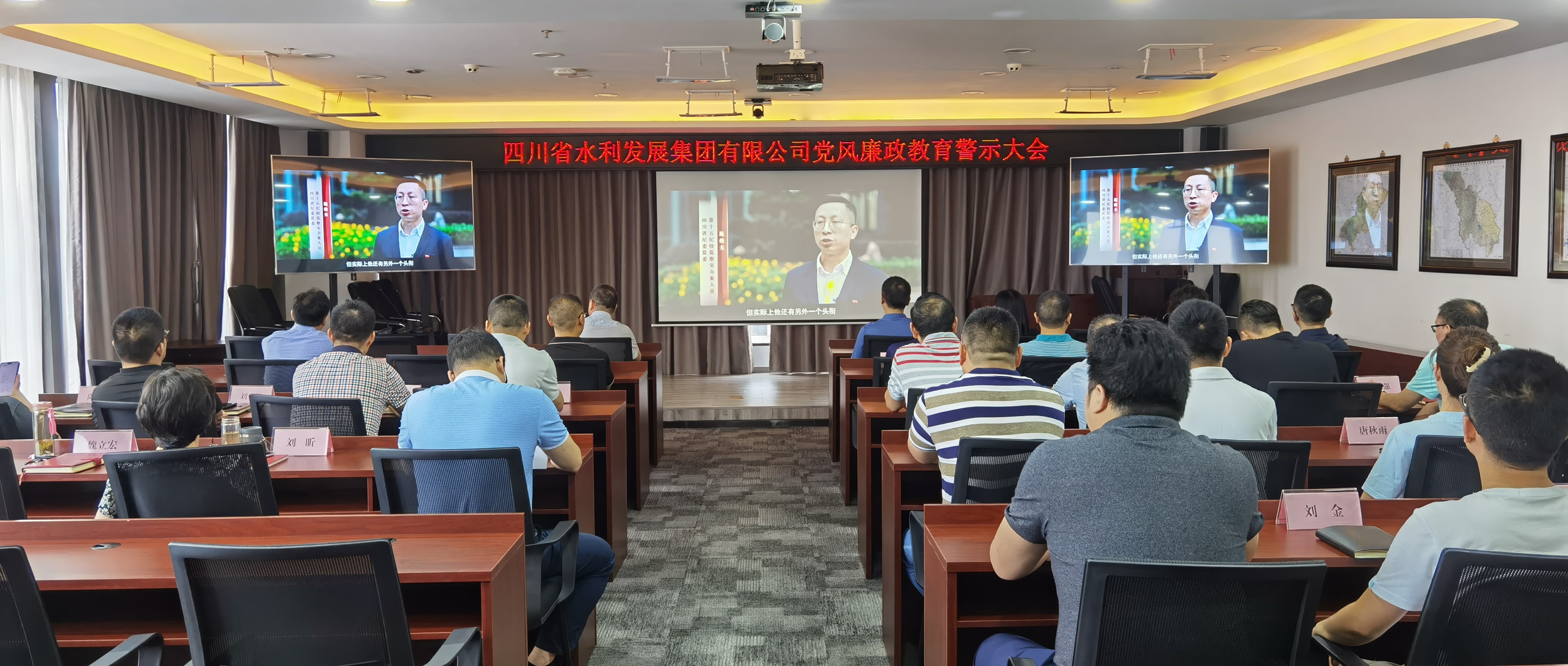 為進一步增強集團黨員干部職工廉潔自律意識,提高拒腐防變能力,7月8日上午,四川省水利發展集團有限公司紀檢監察部按照駐廳紀檢監察組的安排,組織集團總部全體黨員干部職工在集團總部二會議室集中觀看了涉黑涉惡腐敗和“保護傘”典型案件警示片《黑白人生》,旨在通過鮮活生動的案例教育引導全體黨員干部職工警鐘長鳴,始終牢記宗旨意識,恪盡職守,扎實做好本職工作。